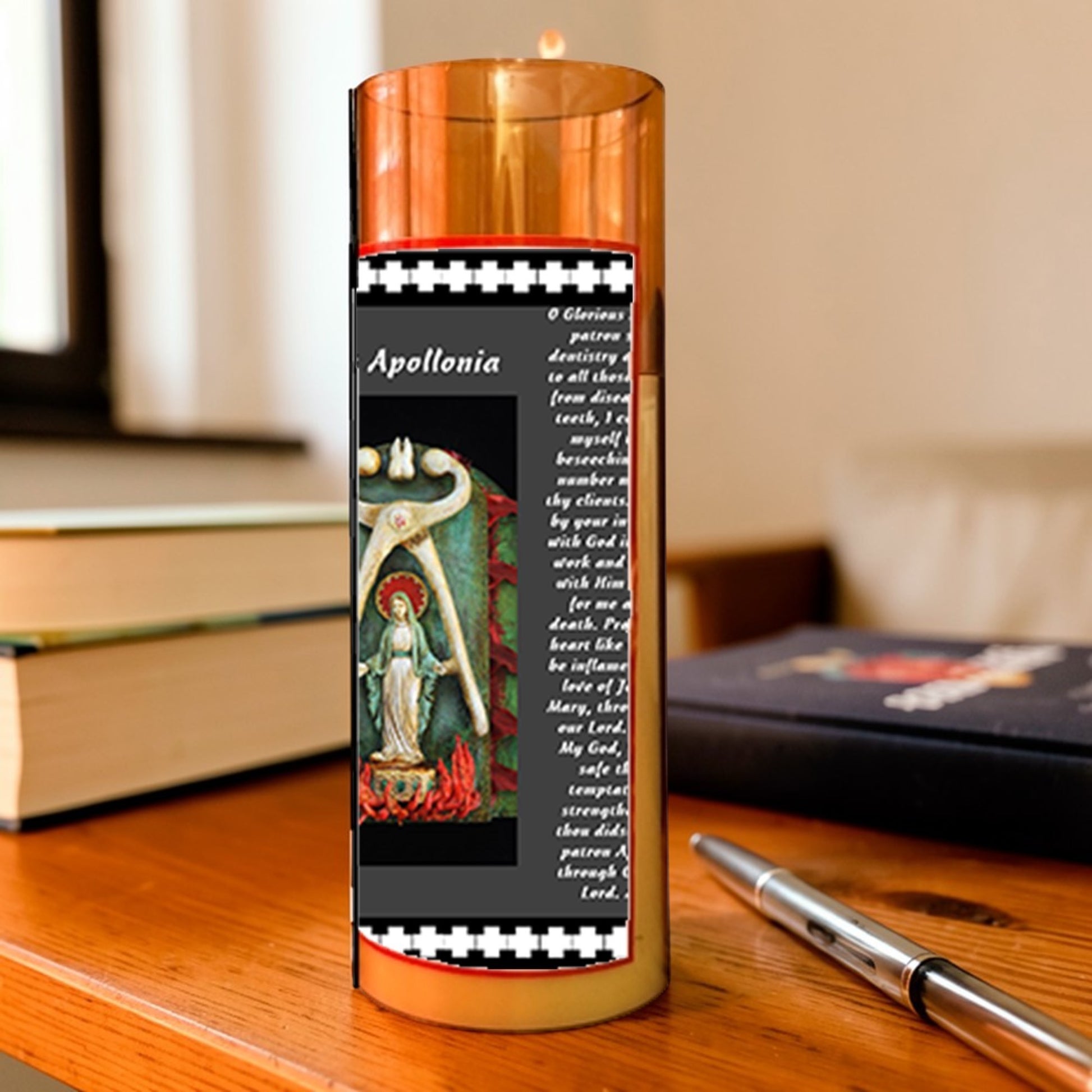 Saint Apollonia Flameless LED Acrylic Pillar Candle with Flickering Flame Battery Operated great for places where an open flame is not allowed hospitals nursing homes dorms-Batteries included