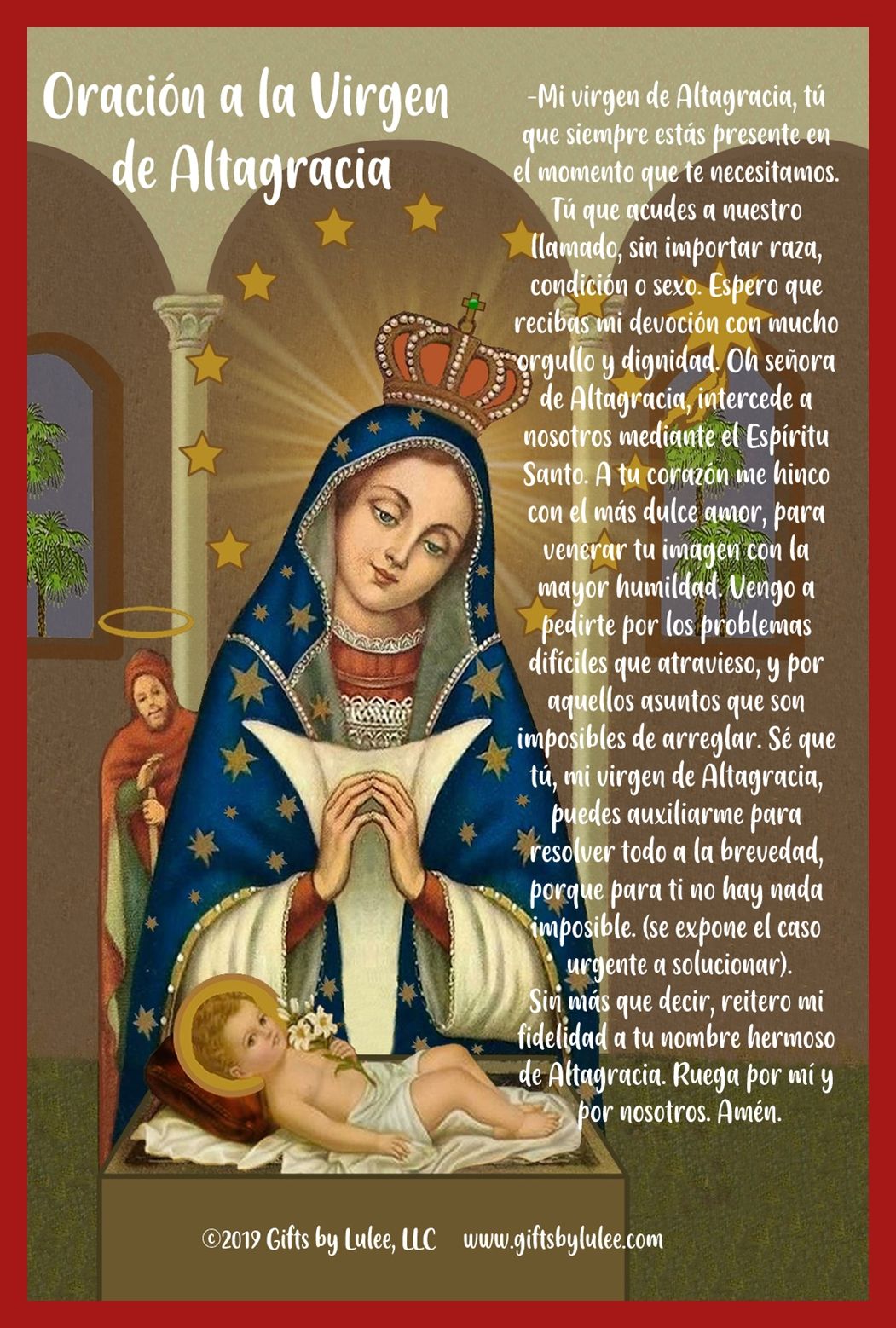Prayer for Saint Altagracia, prayer card included.
