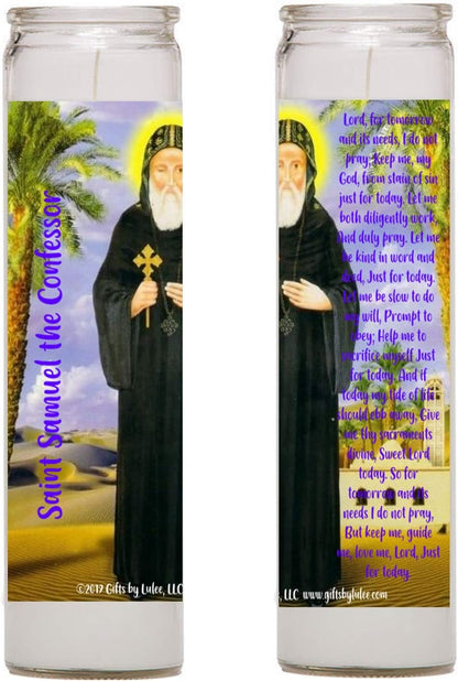 2 veladoras con image de San Samuel el Confesor - Oracion en Ingles y Espanol